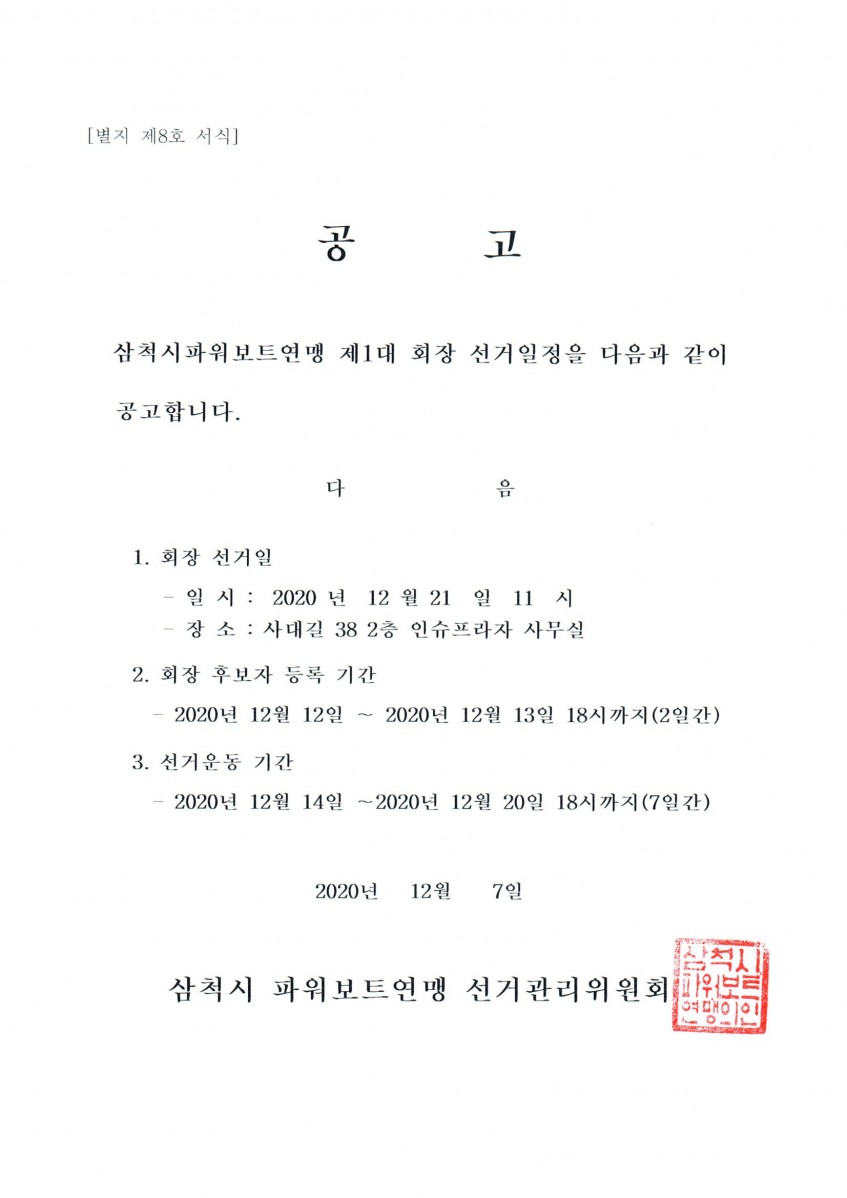 삼척시 파워보트연맹 회장선거 선거일을 붙임과 같이 공고합니다.