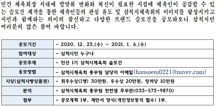 | 19 | 삼척시체육회 슬로건 공모 발표 | 관리자 | 01-13 | 775 |