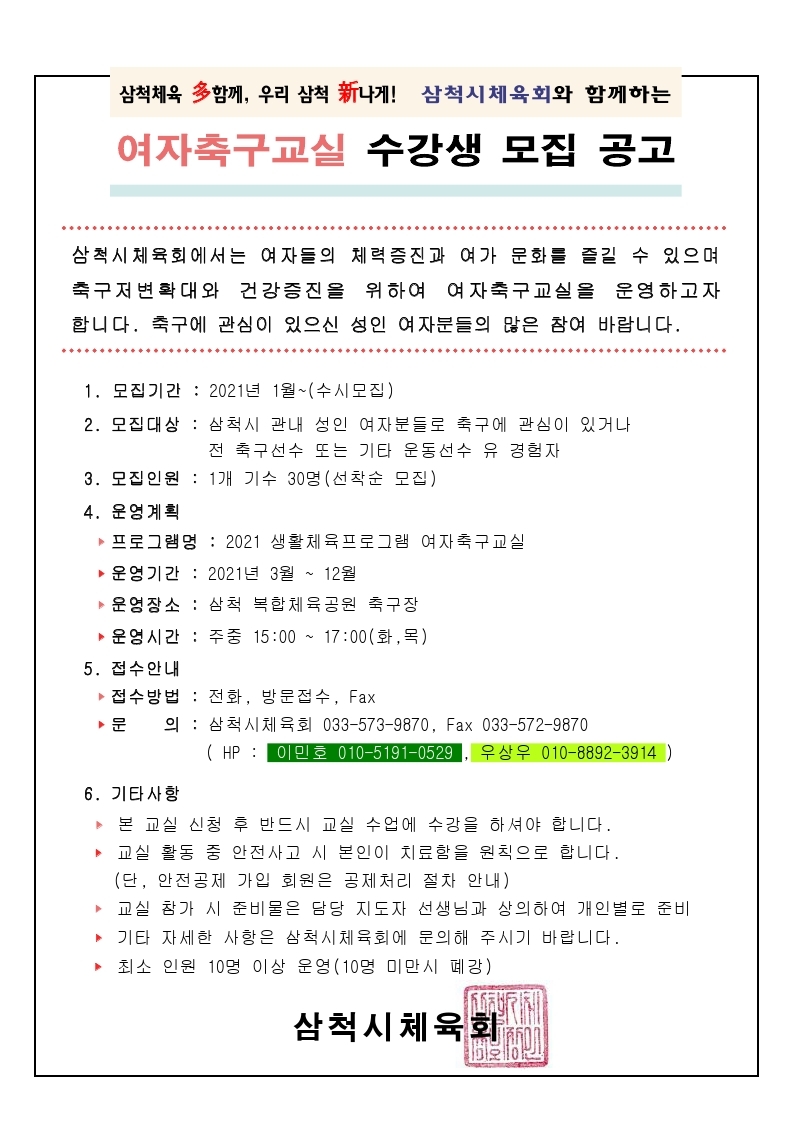| 21 | (사)삼척핸드볼스포츠클럽 사무국 직원 채용 계획 공고 | 관리자 | 02-19 | 982 |