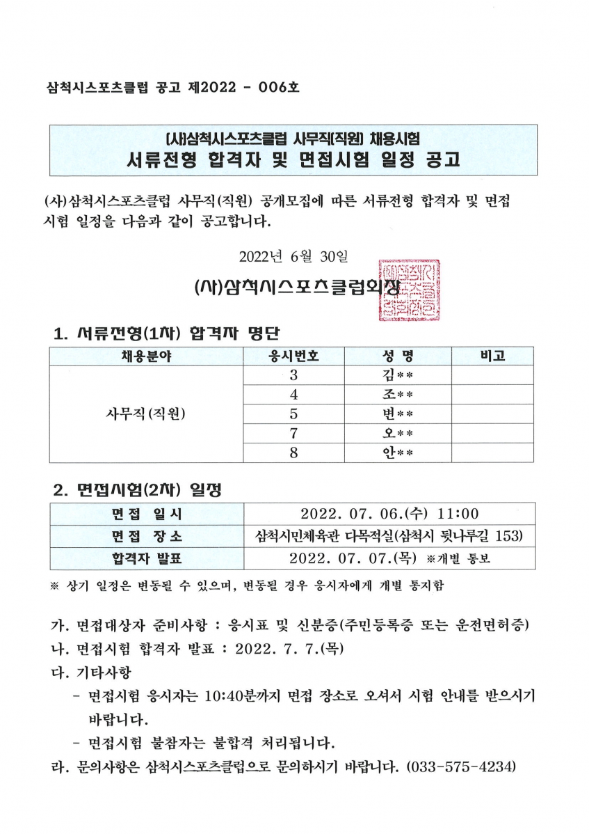 삼척시스포츠클럽 사무직원 1차 서류전형 합격자